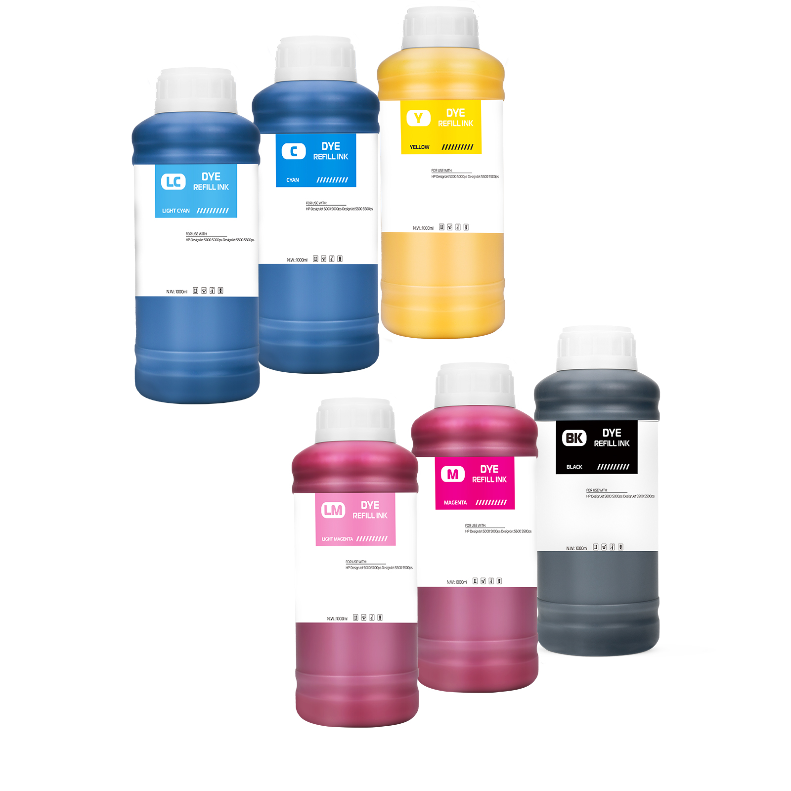 | Ink Type: Dye Ink Volume: 1L/bottle, other volume packaging optional. Colors: BK C M Y LC LM Suitable Printers: HP DesignJet 5000 5000ps DesignJet 5500 5500ps |
