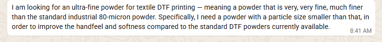 I am looking for an ultra-fine powder for textile DTF printing — meaning a powder that is very, very fine, much finer than the standard industrial 80-micron powder. Specifically, I need a powder with a particle size smaller than that, in order to improve the handfeel and softness compared to the standard DTF powders currently available.