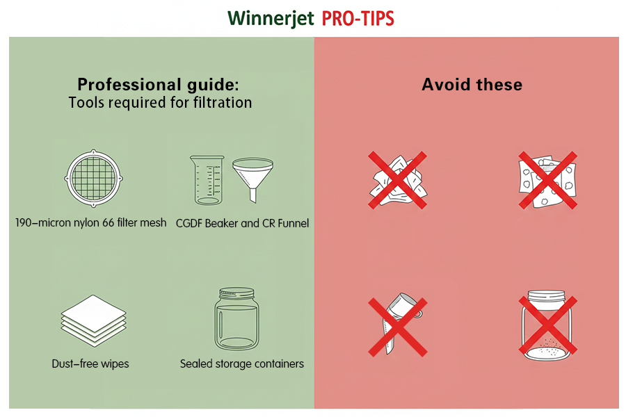 Winnerjet Summary: Straining ink isn’t a waste of time; it’s an insurance policy for your production. Rather than spending days on expensive repairs after a clog, it is far better to spend 5 minutes a day on professional physical straining.
