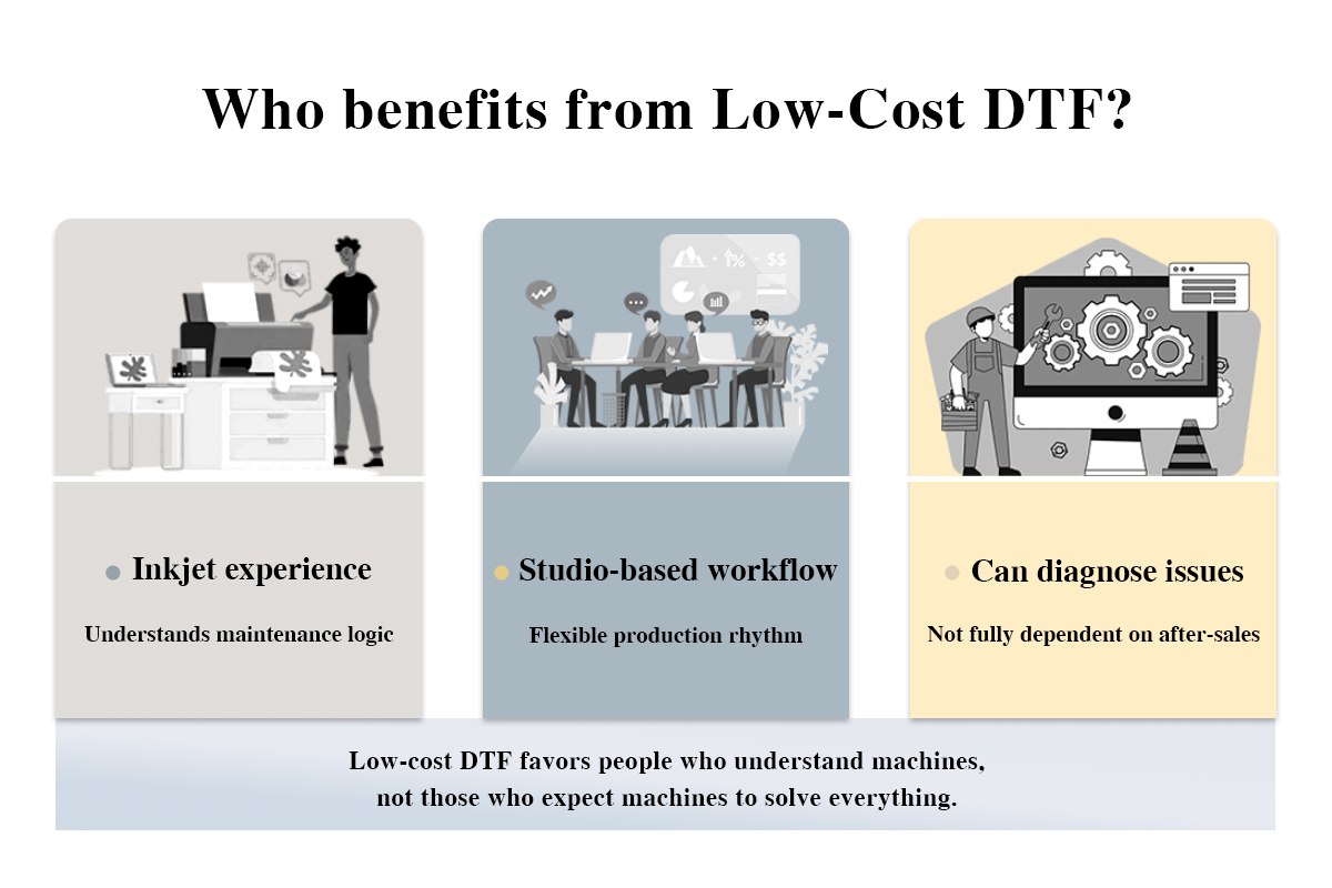 They are familiar with printhead behavior, ink systems, humidity control, and daily cleaning. For them, low-price DTF is not an incomprehensible machine, but a relatively simple system that requires attention. Experience compensates for part of the stability cost.