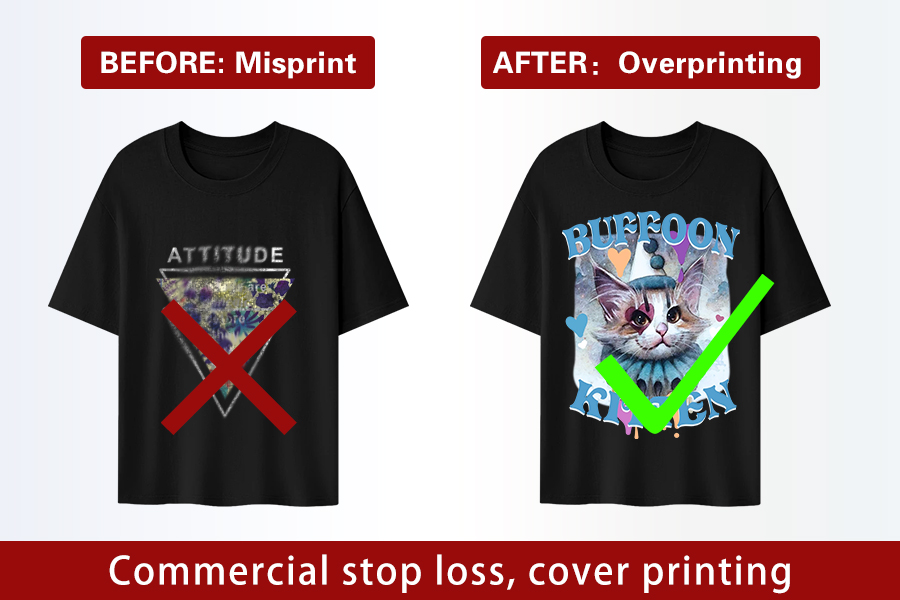 - Overlay new prints on misprints to preserve garment value and save production costs.