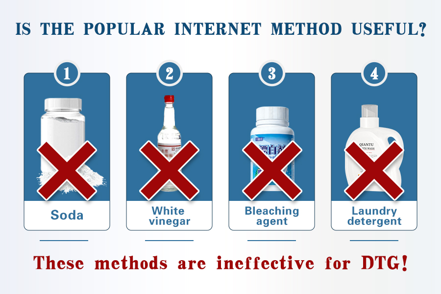 Many online suggestions—baking soda, vinegar, detergent, or bleach—may work for ordinary stains (coffee, juice, light pigment), but DTG ink behaves differently.