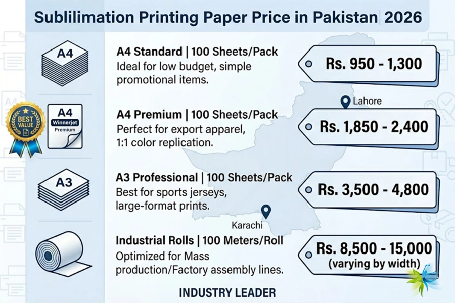 The sublimation customization market in Pakistan is booming in 2026, but inflation has simultaneously driven up supply costs. Currently, the market price for A4 sublimation paper ranges from approximately Rs. 950 to Rs. 2,400 per pack (100 sheets), depending largely on coating quality and transfer rates.